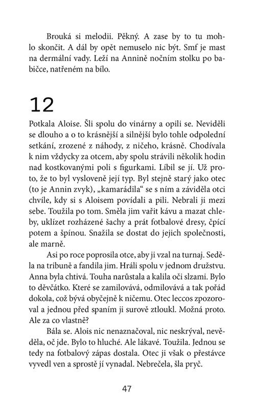 Směje se. Měří sto sedmdesát centimetrů. Jmenuje se Anna. Už vůbec není, už dávno neexistuje. Je někdo úplně jiný, jenom to jméno a vlasy má pořád stejné. Její současný život není život, až na těch pár chvilek, kdy bývá ráda. Sama sebe předstírá. Blaho lásky trvá jen okamžik. Smutek lásky celý...