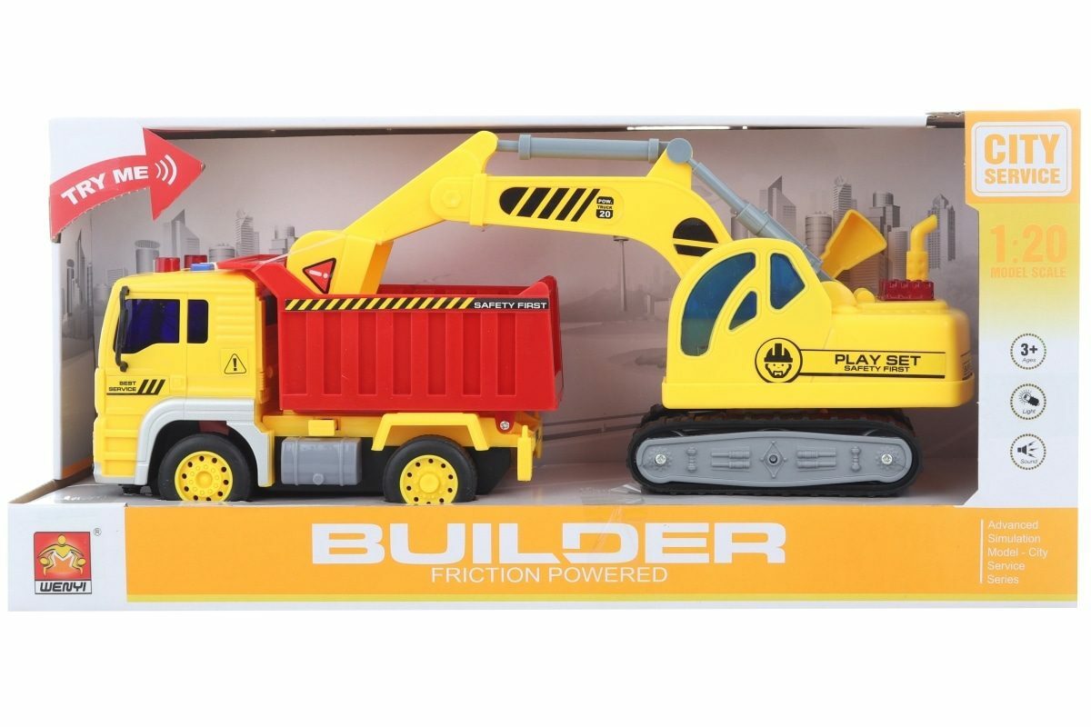 Bagr a sklápěčka na baterie. Po stisknutí tlačítek sklápěčka vydává zvuky a svítí. Rozměry sklápěčky cca 17,5 x 9 x 8 cm. Rozměry balení cca 39,5 x 18,5 x 12 cm. Napájení na 3 AG13 (jsou součástí balení). Věk 3+
