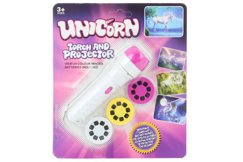 Plastový projektor na baterie. Součástí jsou 3 kotoučky s obrázky (celkem 24 obrázků). Po stisknutí tlačítka projektor promítá obrázky na zeď (nebo jinou bílou plochu). Napájení na 3 AG13 baterie (jsou součástí). Rozměry projektoru cca 12 x 3,5 cm. Rozměry balení cca 16 x 18,5 x 3,5 cm. Věk...