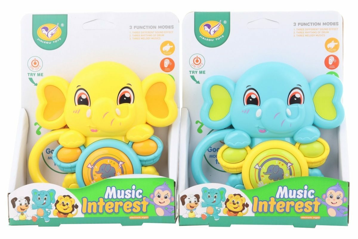 Baby slůně pro nejmenší. Slůně hraje po zmáčknutí bubínku 9 různýh melodií a zvuků. Napájení na 2 AAA baterie (jsou součástí). Rozměry sluněte cca 12,5 x 12,5 cm. Rozměry balení cca 14 x 18 x 4,5 cm. Věk 12m+