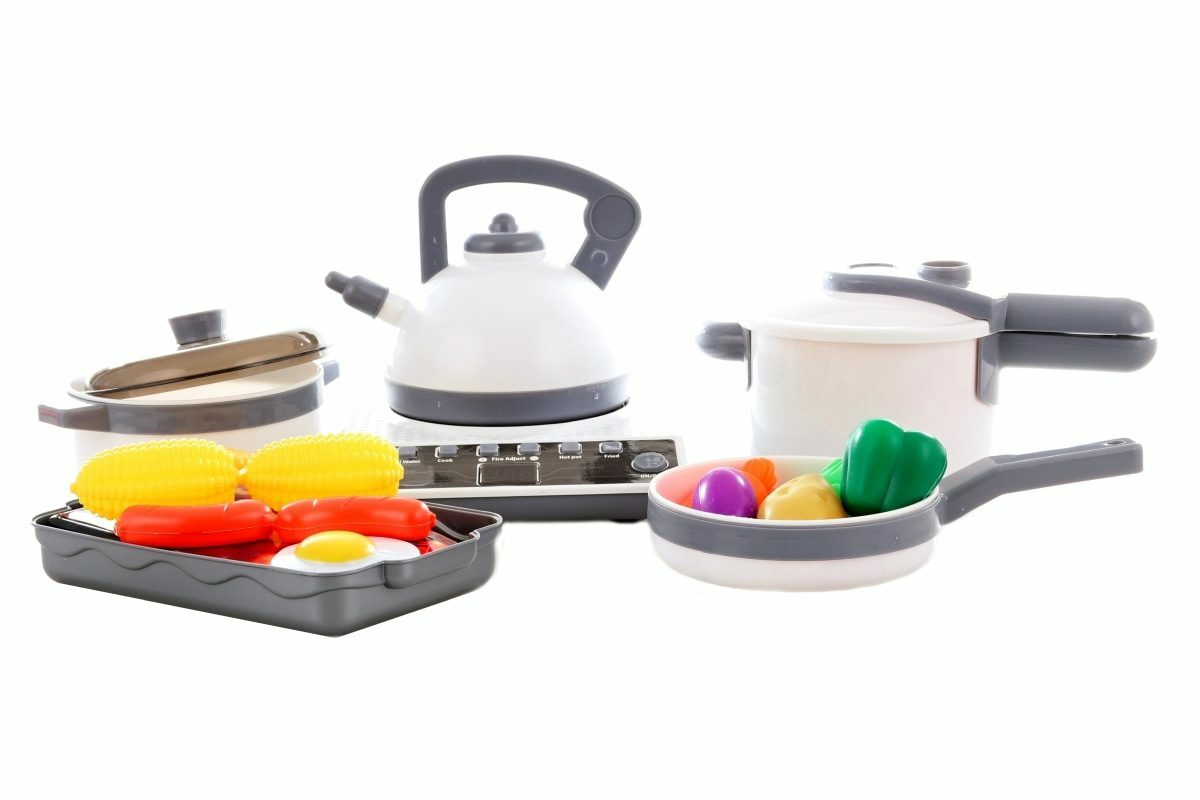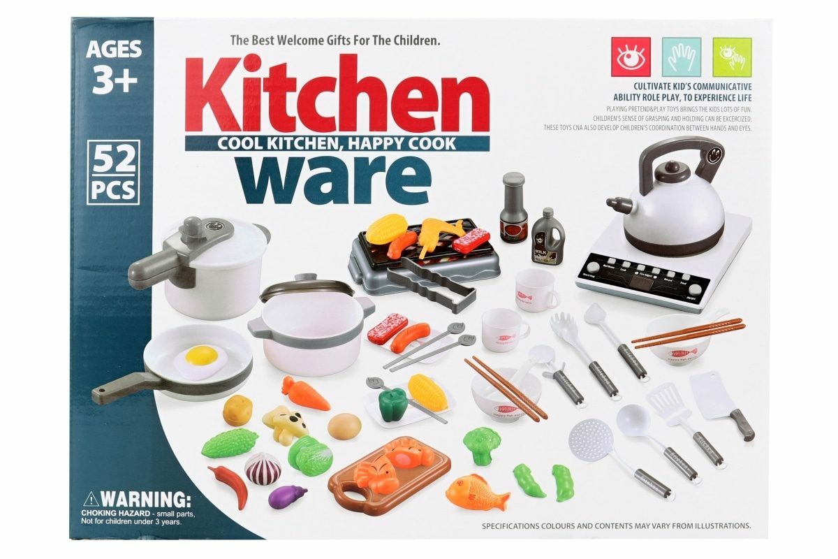 Velká sada nádobí s vařičem a grilem. Balení obsahuje vařič, hrnec, gril, tlakový hrnec, pánev, potraviny a další doplňky. Vařič je funkční na 3 AA baterie (nejsou součástí). Rozměry balení cca 31 x 23 x 18,5 cm. Věk 3+