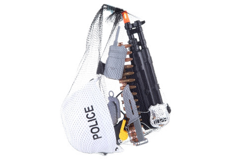 Policejní sada obsahuje helmu, samopal, pásek s náboji, vysílačku, nůž, granát, odznak, píšťalku. Baleno v síťce. Rozměr balení cca 48 x 22 x 16 cm. Věk 3+