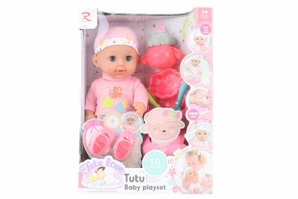 Miminko s doplňky. Panenka po vložení baterií vydává zvuky a čůrá. Balení obsahuje také botičky pro panenku, plastový bryndáček, lahvičku, talířek a další doplňky. Napájení na 3 AG13 baterie (jsou součástí balení). Rozměry miminka 30 x 12 cm. Rozměry balení cca 24 x 33 x 11 cm. Věk...