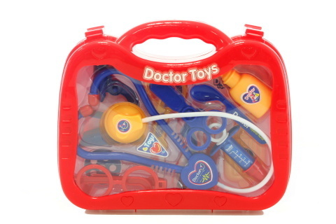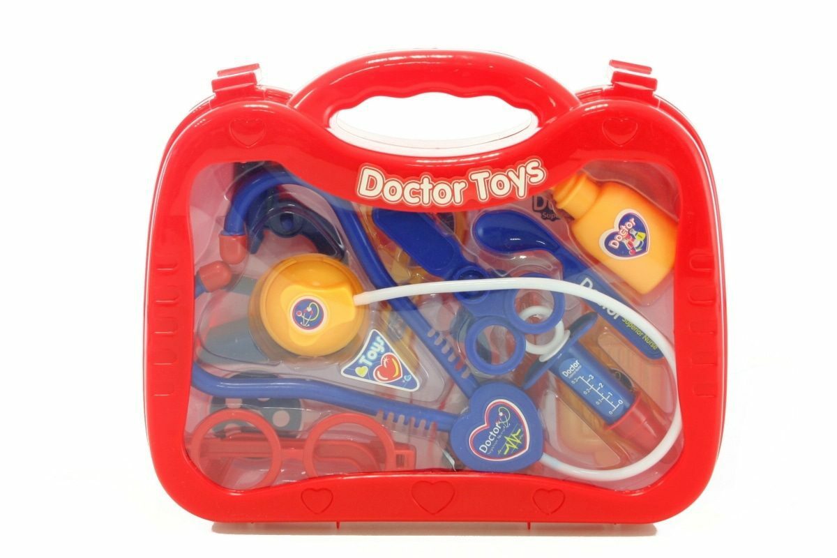 Doktorský kufřík o velikosti cca 26 cm X 21 cm,který obsahuje fonendoskop,injekční stříkačku,brýle,nůžky a další pomůcky pro malé lékaře.Věk 3+