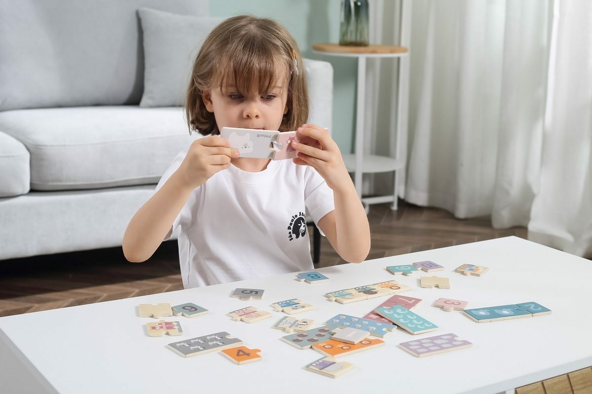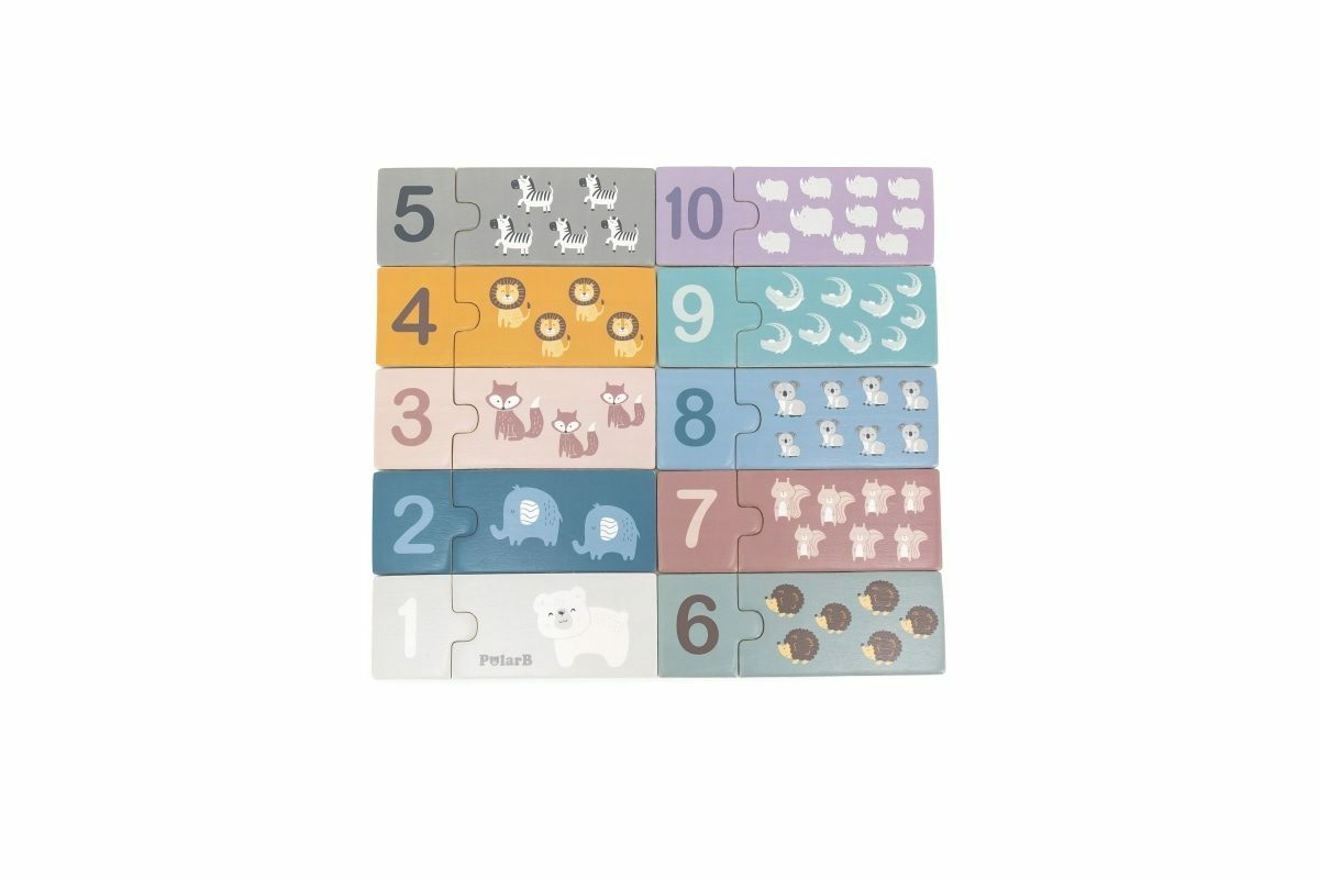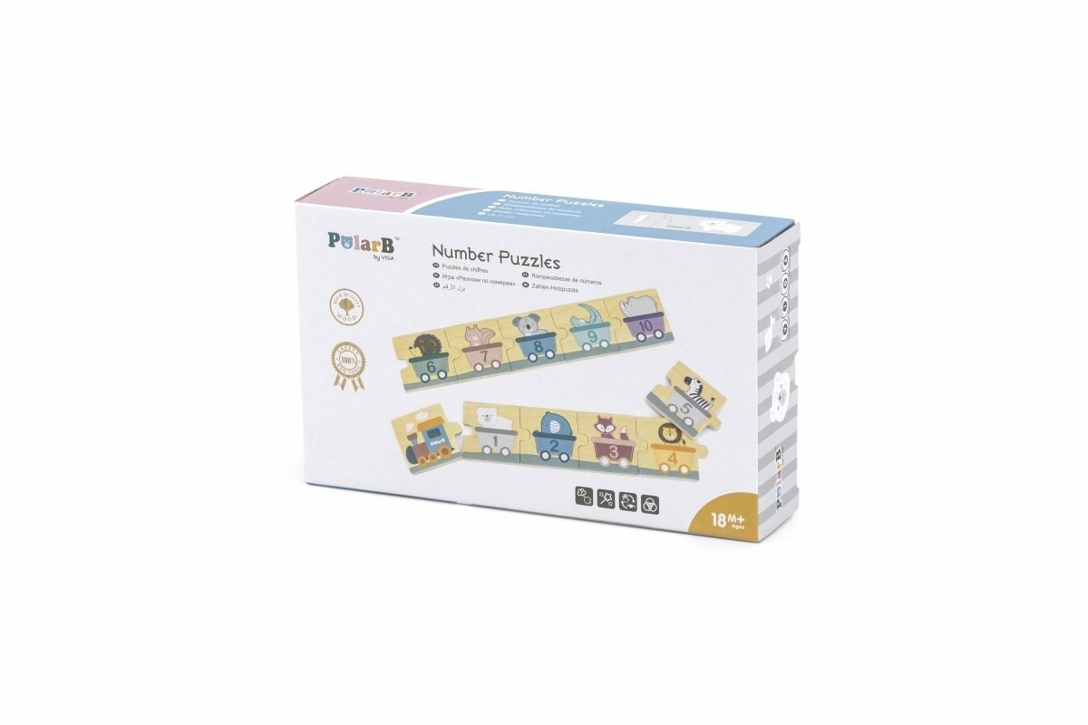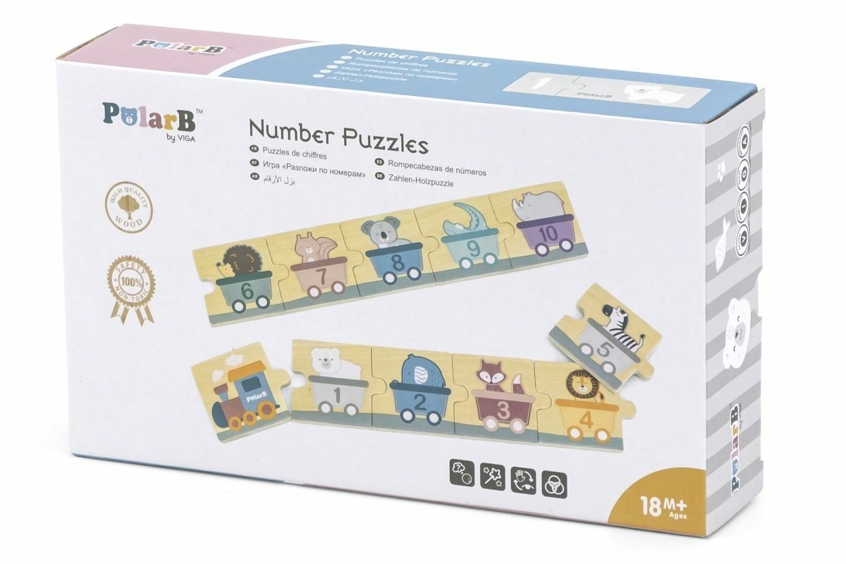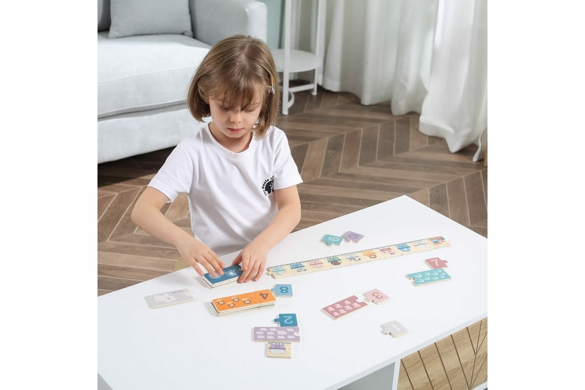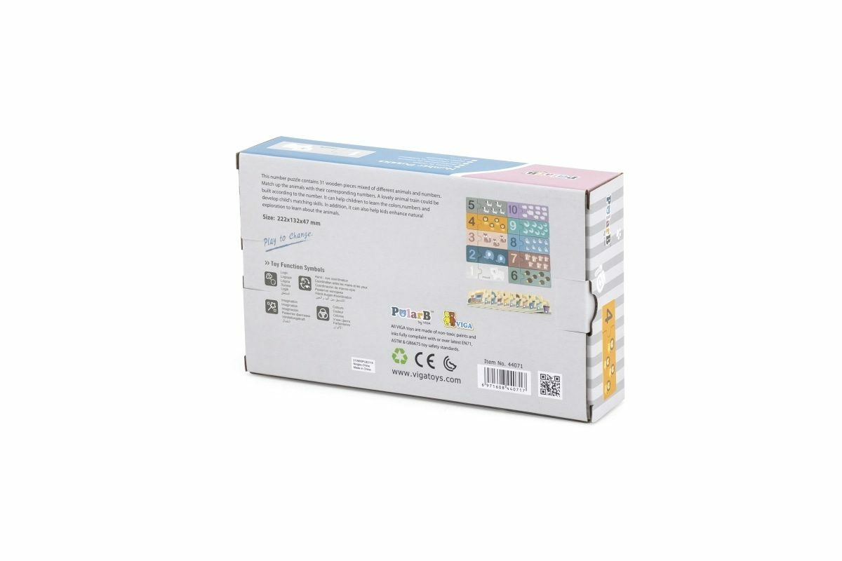 Dřevěná hra se skládá z 20 barevných prvků: 10 s čísly a 10 s různým počtem zvířátek. Na rubové straně jsou nakresleny vagóny se zvířátky a čísly. Úkolem dětí je správně spojovat dílky skládačky tak, aby se shodovala čísla a počet zvířátek. Nebo vytvořte vlak z vagónů s čísly v sestupném nebo...