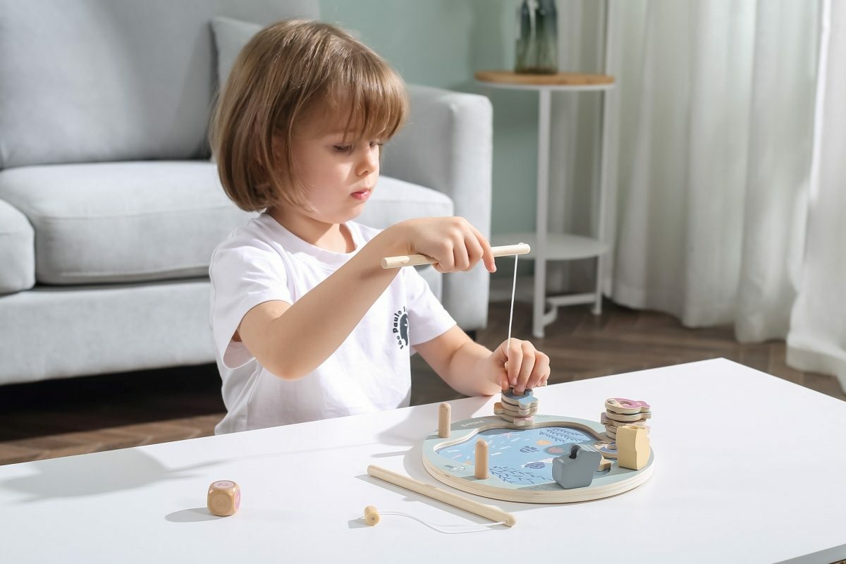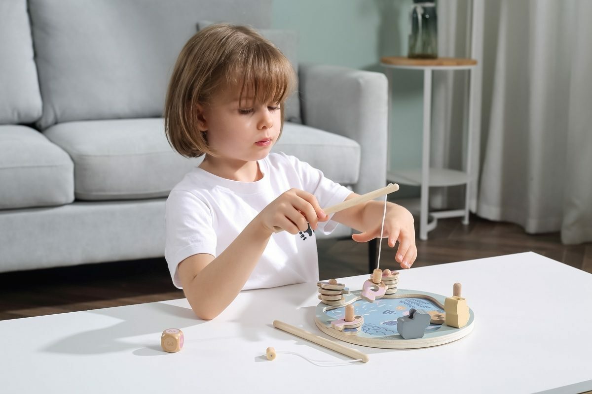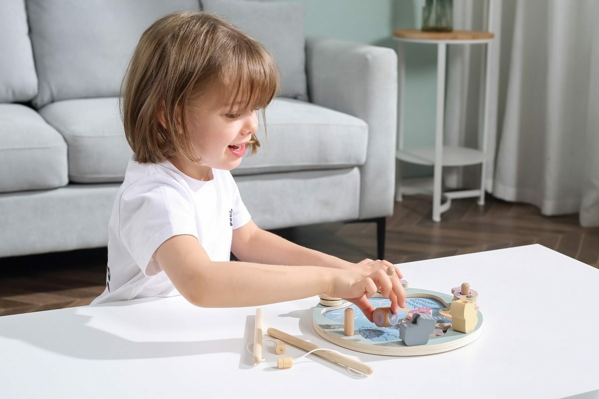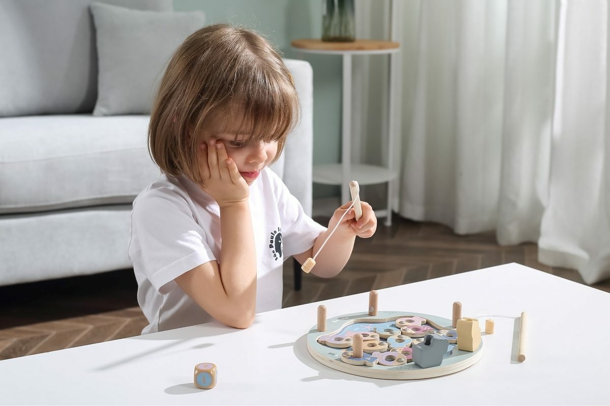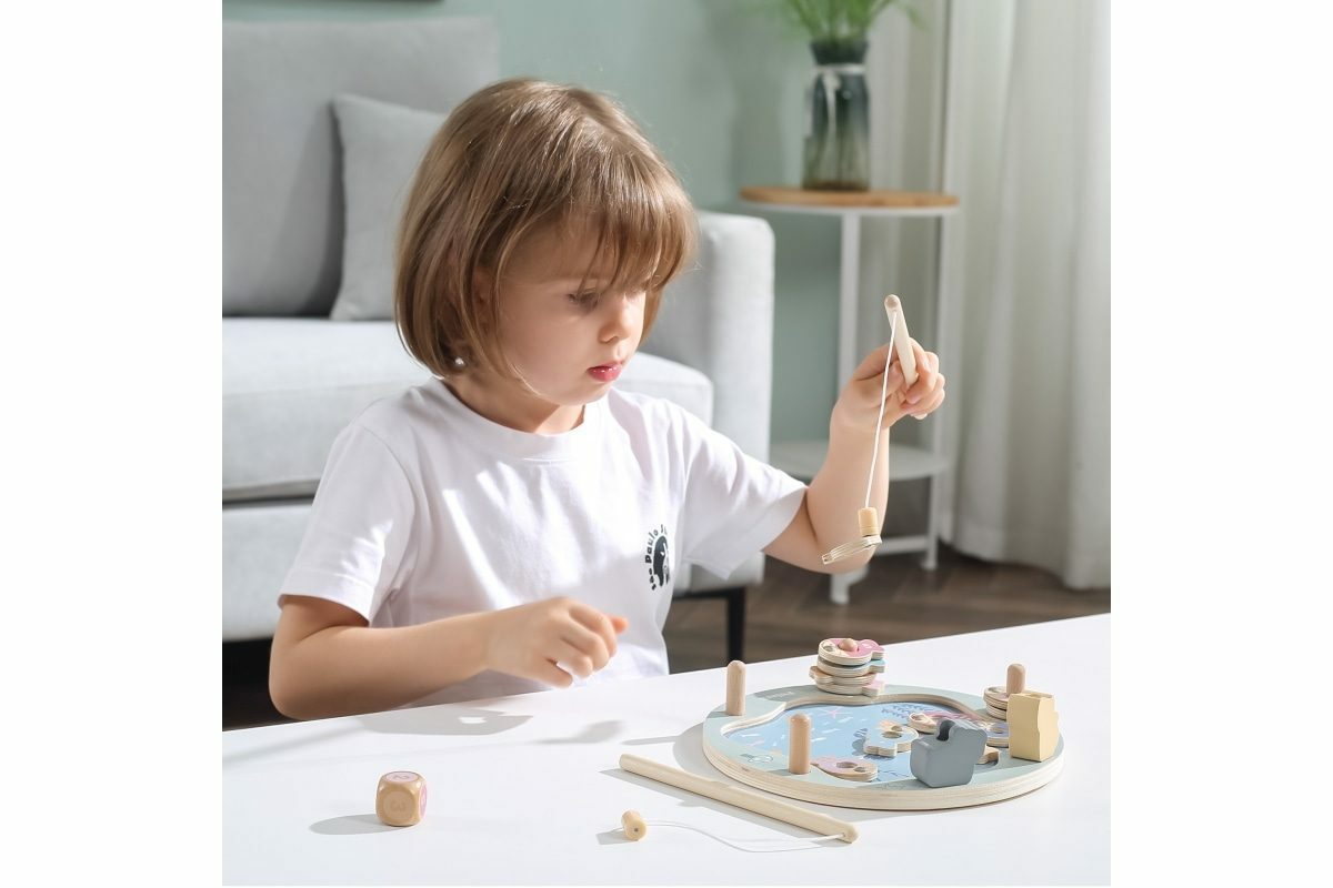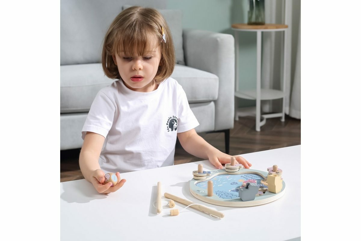 Tato magnetická rybářská hra se skládá z rybníka, 12 ryb, kostky a dvou rybářských prutů. Pomocí magnetických tyčí chyťte ryby a položte je na dřevěný kus. Ryby lze rozlišit buď podle barvy, nebo podle čísla na zadní straně, takže je to skvělý nástroj pro představení pojmů barva a číslo. Pomáhá...