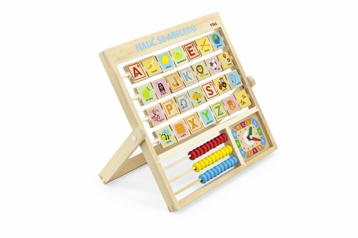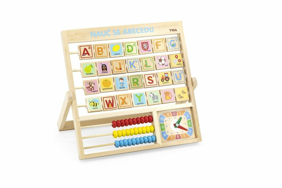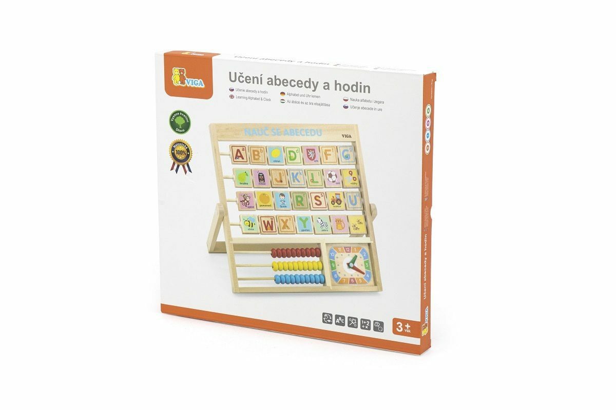 Dřevěná abeceda a hodiny v českém jazyce. Děti se mohou naučit písmena, čísla a získat obecnou představu o hodinách. Každé písmeno má na druhé straně slovo pro lepší zapamatování. Rozměry cca 32,5 x 32 x 2,3 cm. Rozměry balení cca 34 x 32,5 x 3 cm. Věk 3+