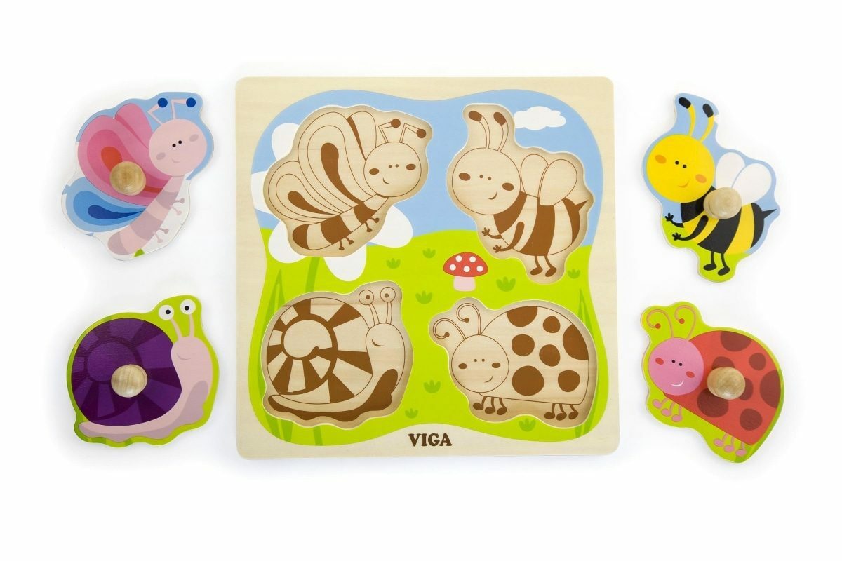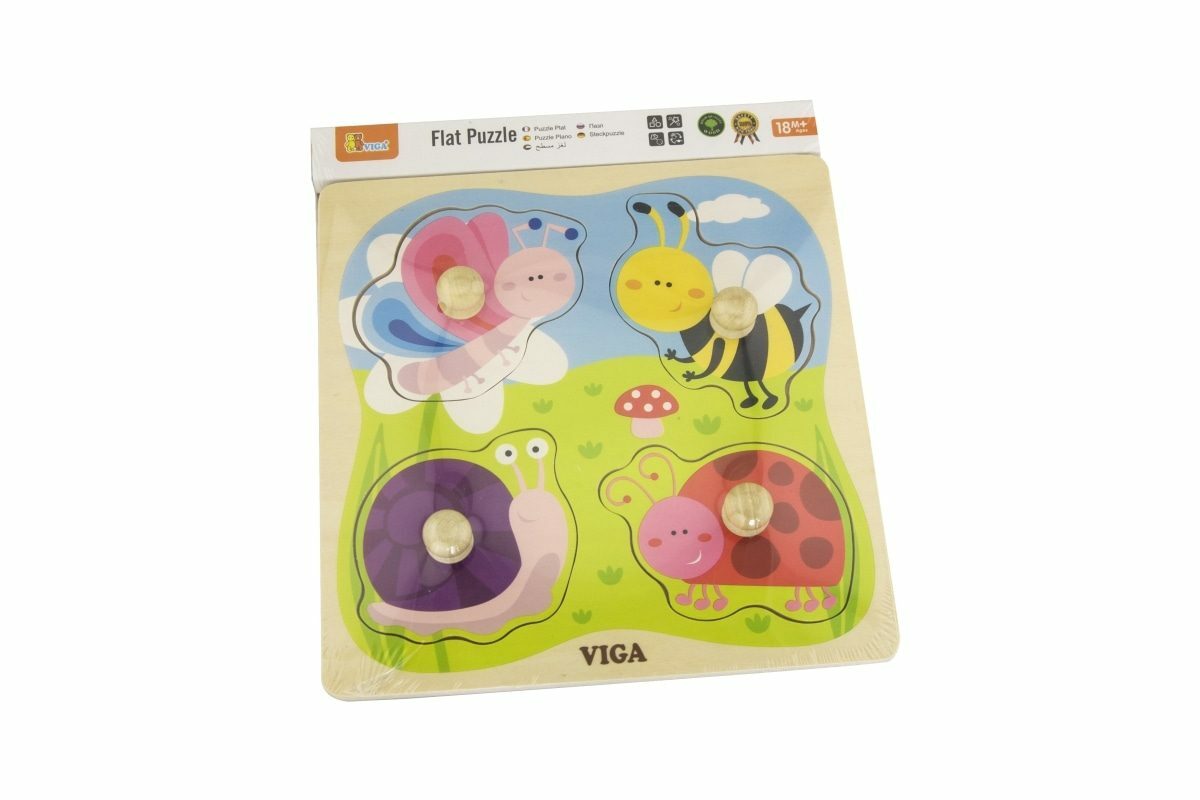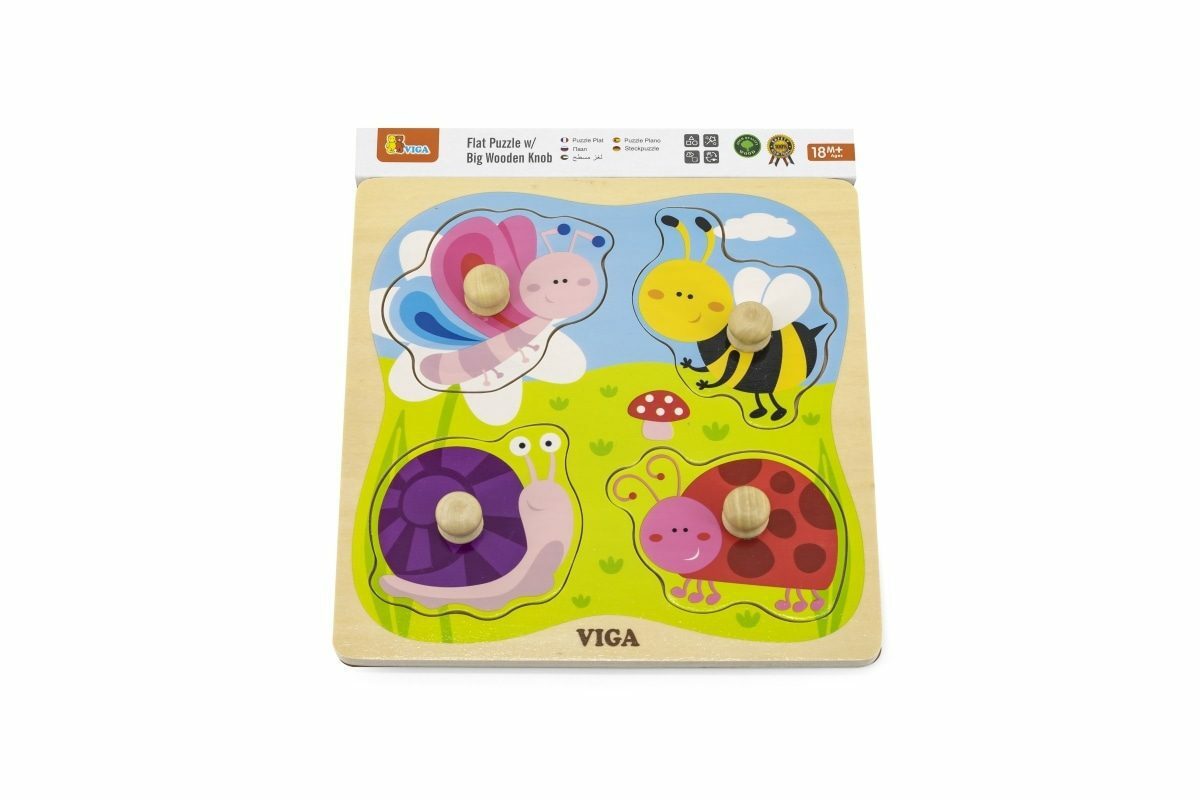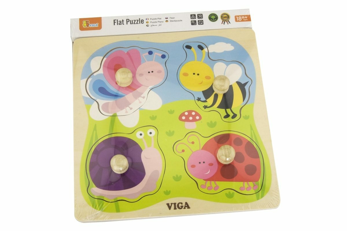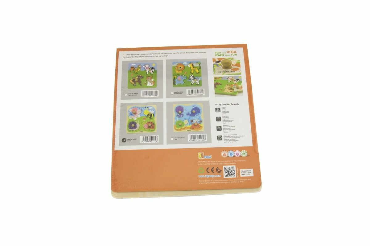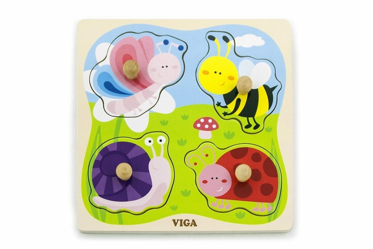 Dřevěná vkládačka se zvířátky. Rozměry dřevěné desky cca 22 x 22 cm x 1 cm,kde jsou umístěny 4 druhy zvířátek s úchyty. Věk 18m+