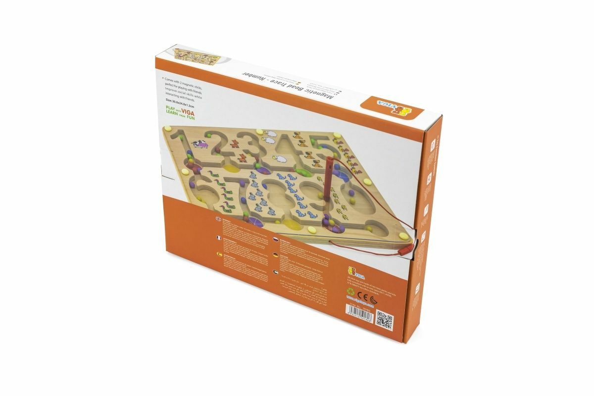 Dřevěný magnetický labyrint s kuličkami ve tvaru čísel. Rozměry cca 30 x 22 x 1,3 cm. Rozměry balení cca 31 x 25,5 x 4 cm. Věk 18m+