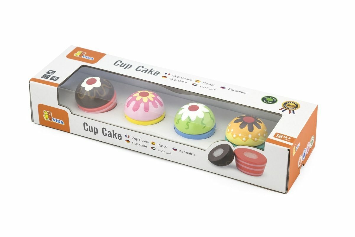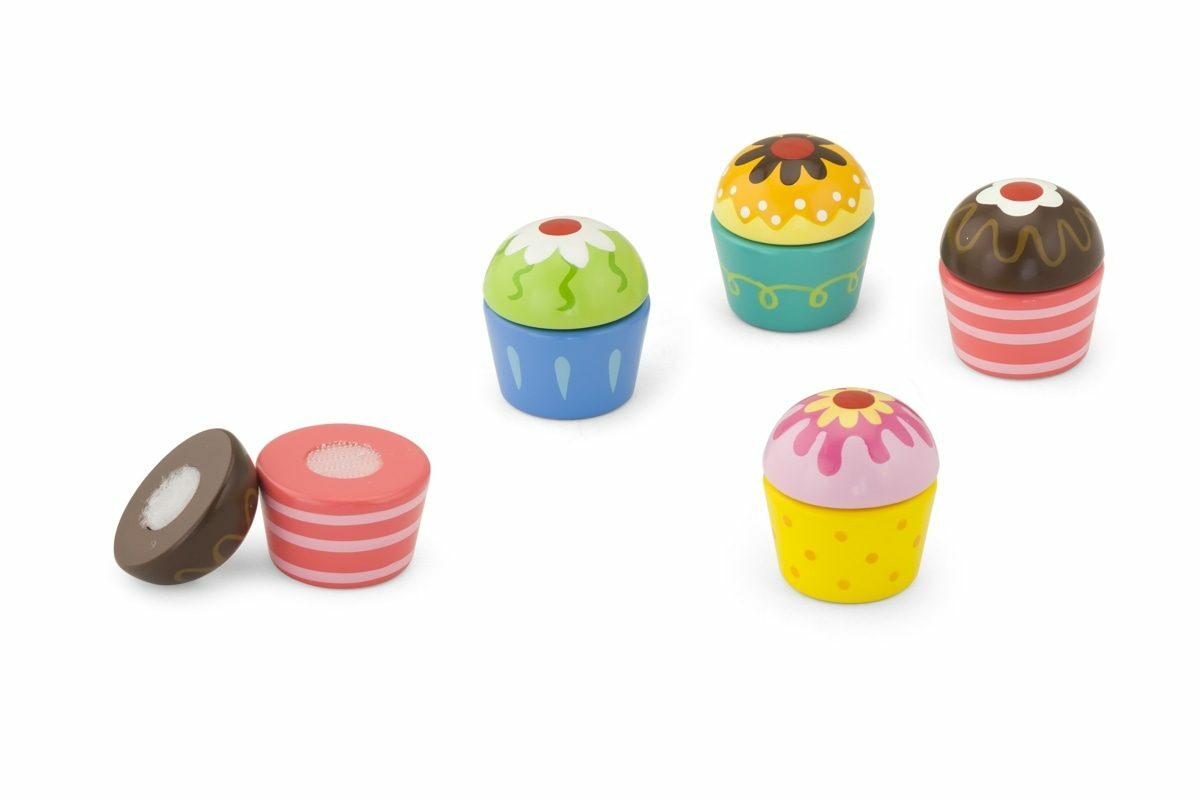Sada 4 dřevěných dortíků. Jednotlivé poloviny dortíků jsou spojeny suchým zipem, takže je lze oddělit. Rozměry dortíku cca 4,5 x 4,5 x 6 cm. Rozměry balení cca30 x 6 x 9 cm. Věk 18m+