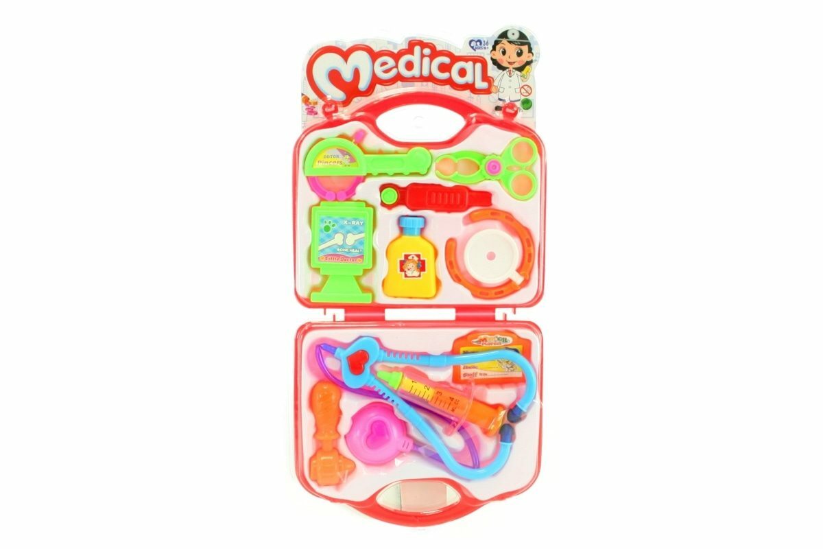 Plastová doktorka v kufříku o rozměru cca 19 x 22 cm. Sada obsahuje vše potřebné pro malého doktora - stetoskop pískací, injekce, kladívko, brýle a spoustu dalšího náčiní. Rozměry balení cca 45 x 22 x 3 cm. Věk 3+