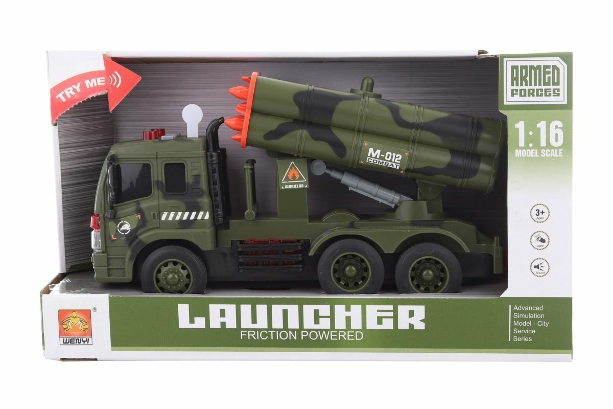 Vojenské auto s raketami na baterie, po stisknutí tlačítek vydává zvuky a svítí. Rozměr auta cca 25 x 14 cm. Rozměry balení cca 32 x 12 x 18,5 cm. Napájení 3x AG13 (jsou součástí). Věk 3+