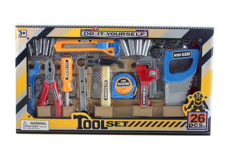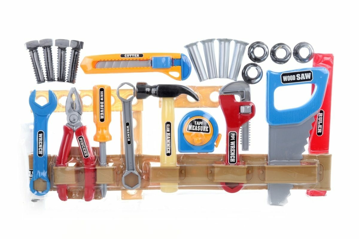 Plastová sada nářadí pro malého kutila. Obsahuje pilku, kleště, kladívko, hasák, šroubovák, klíč, nožík, pás na uspořádání a další nářadí. Rozměry balení cca 45,5 x 5,5 x 25,5 cm. Věk 3+
