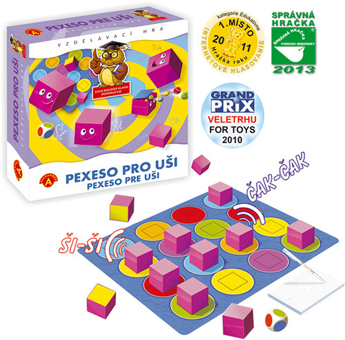 Děti hledají 2 kostky se stejným zvukem. Hra obsahuje i těžší variantu od 8 let se speciální barevnou hrací deskou. Obsahuje 16 zvukových krychliček, barevnou kostku, hrací desku, návod a poznámkový bloček. Rozměry balení 24,5 x 25,5 x 6 cm Vhodné od 4 let a od 8 let