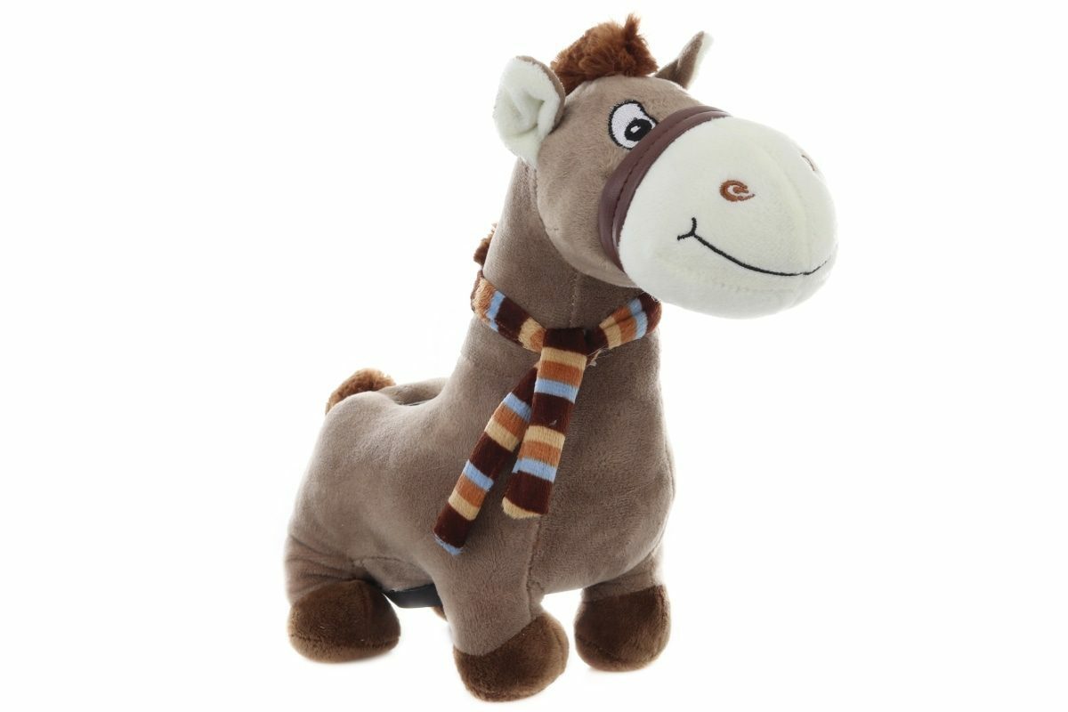 Plyšová pokladnička kůň. Po vhození mince koník vydává zvuky a svítí. Obsahuje neměnitelné baterie. Rozměry cca 32 x 27 x 10 cm. Věk 3+