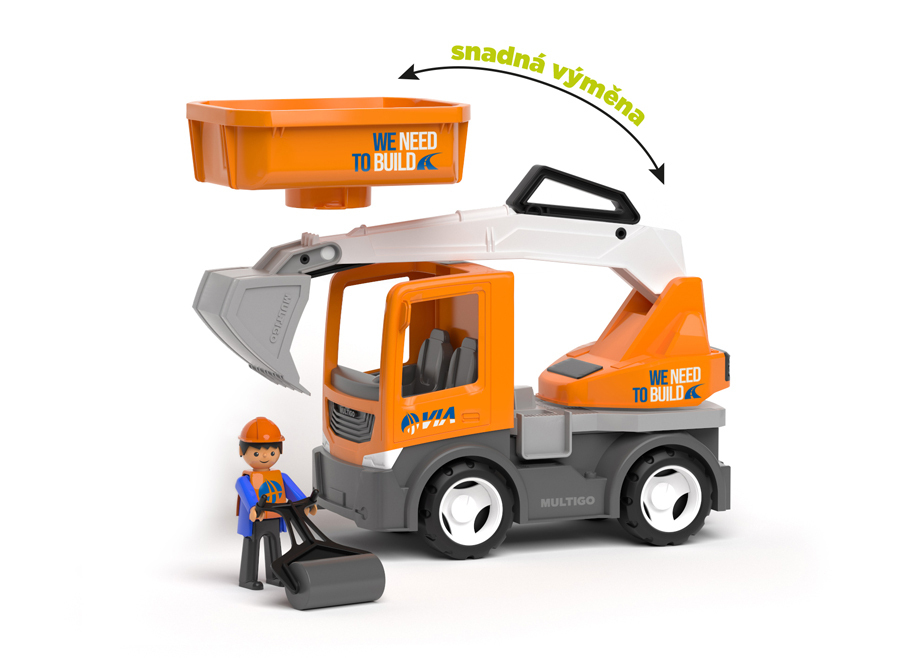 • MultiGO VIA set obsahuje: auto – tahač, výměnnou nástavbu bagr, výměnnou nástavbu valníček, ruční