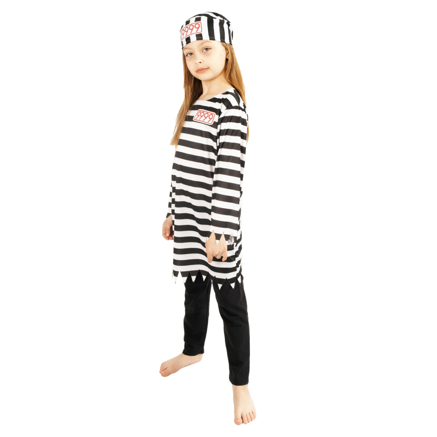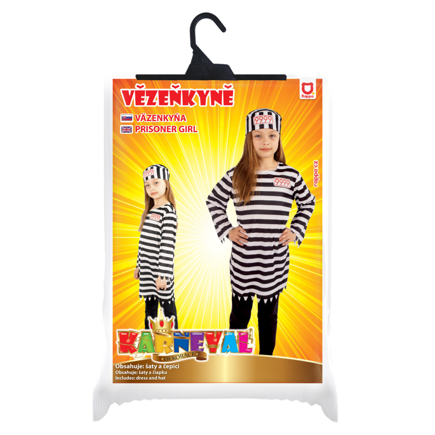 Pruhovaný karnevalový kostým vězeňkyně v typických bílo-černých barvách ve velikosti S je určen pro děvčata ve věku 4-6 let (105-116 cm). Kostým obsahuje dlouhé triko a čepici s číslem vězně.
