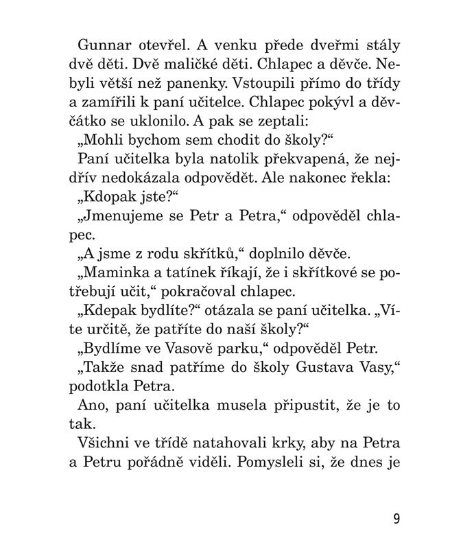 V jedné stockholmské škole se před několika lety stalo něco opravdu pozoruhodného. V první třídě měli právě čtení a vtom se ozvalo zaklepání na dveře. A když se dveře otevřely, stály za nimi dvě maličké děti, ne větší než panenky. Petr a Petra, tak se skřítkové jmenovali, poprosili paní...