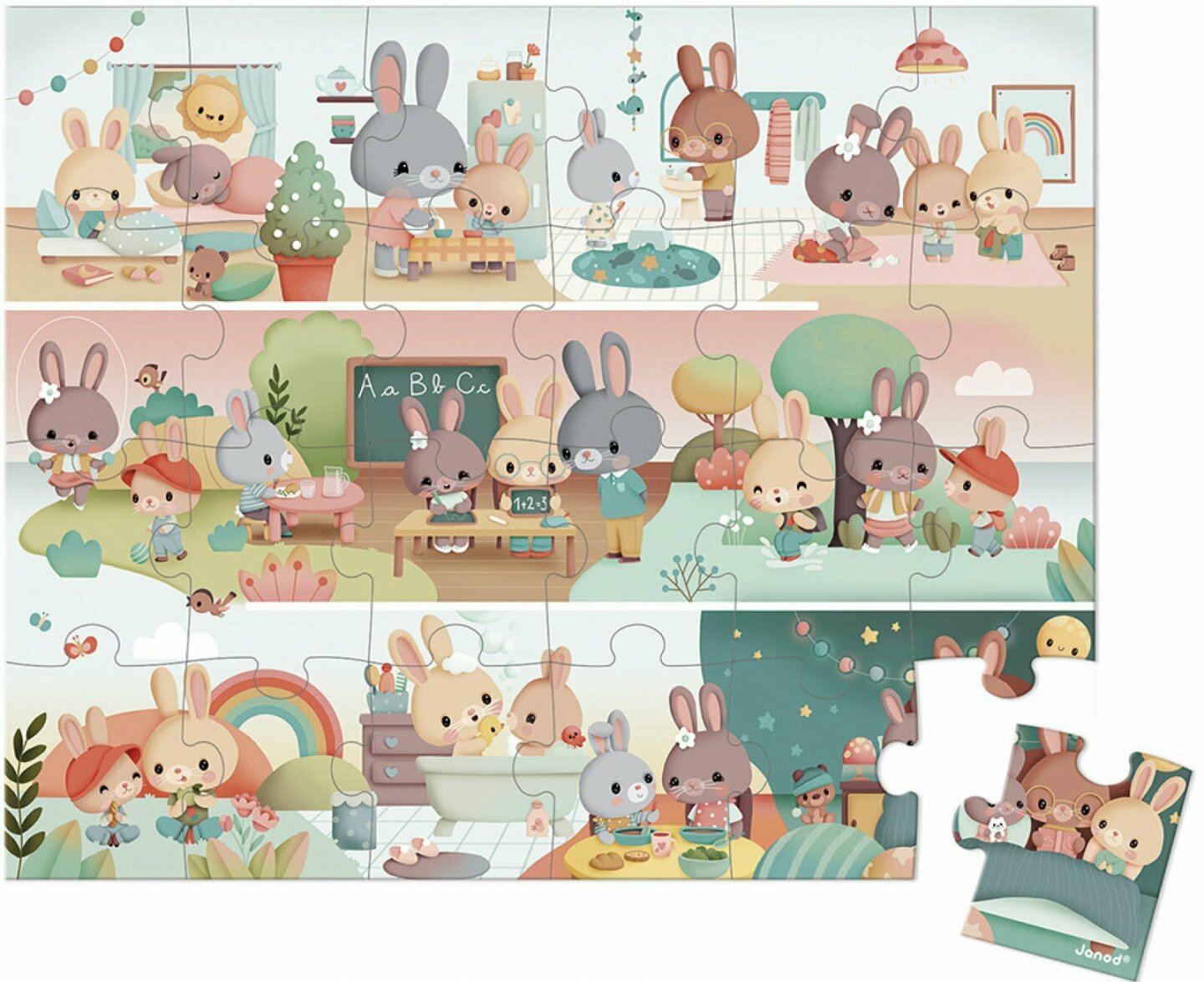 Puzzle JANOD s obrázkem králíčků v průběhu celého dne. Puzzle je baleno v originálním a praktickém kufříku vhodném na doma i na cesty. Součástí balení je plakátová předloha.