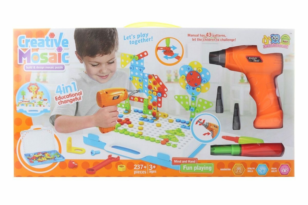 Šroubovací stavebnice s vrtačkou. Balení obsahuje celkem 237 dílů, vrtačku, šroubovák a praktický plastový kufřík, do kterého lze díly uschovat. Součástí balení je také návod. Napájení vrtačky je na 2 AA baterie (nejsou součástí balení). Rozměry balení cca 46 x 24,5 x 7 cm. Věk...