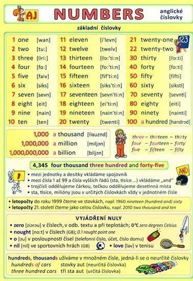 Kompletně zpracovaný přehled anglických číslovek, který pomůže zvládnout gramatiku všem malým i velkým školákům. Obsahuje základ...