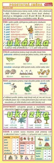 Praktická záložka obsahuje základní mluvnické kategorie podstatných jmen (pád, číslo, rod, životnost), dále vzory a rozdělení po...