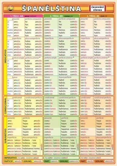 Přehledné tabulky časování španělských pravidelných sloves a pomocného slovesa haber. Pomůcka obsahuje rovněž pravopisné zvláštn...