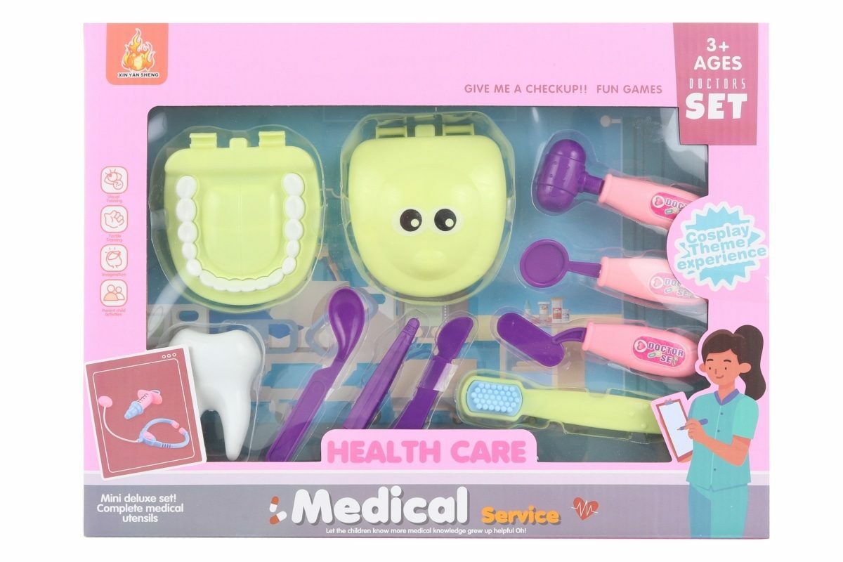 Sada s vybavením zubní ordinace. Obsahuje otevírací zuby, samostatný zub, kartáček, pinzetu, lžičku zrcátko, kladívko, skalpel, a další doplňky. Rozměry balení cca 36 x 27,5 x 4 cm. Věk 3+