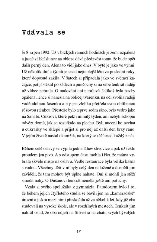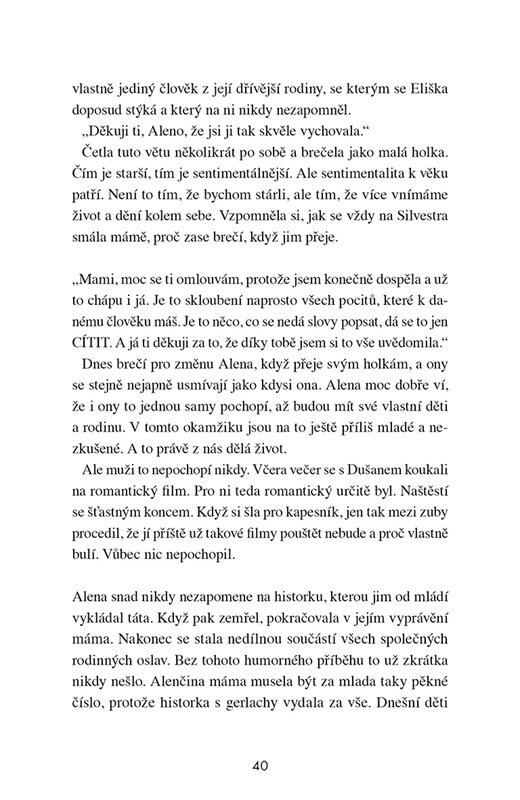 Je jedno srpnové ráno a Alena se vdává. Pro každou ženu je to začátek nové etapy s příslibem krásného života. Jenomže pak přijde tvrdá realita, kdy se přestane vznášet na obláčcích něhy a radosti a je jen na ní, jak se z té šlamastiky dostane. Musí zajistit nejen péči o dcery, o domácnost, ale...