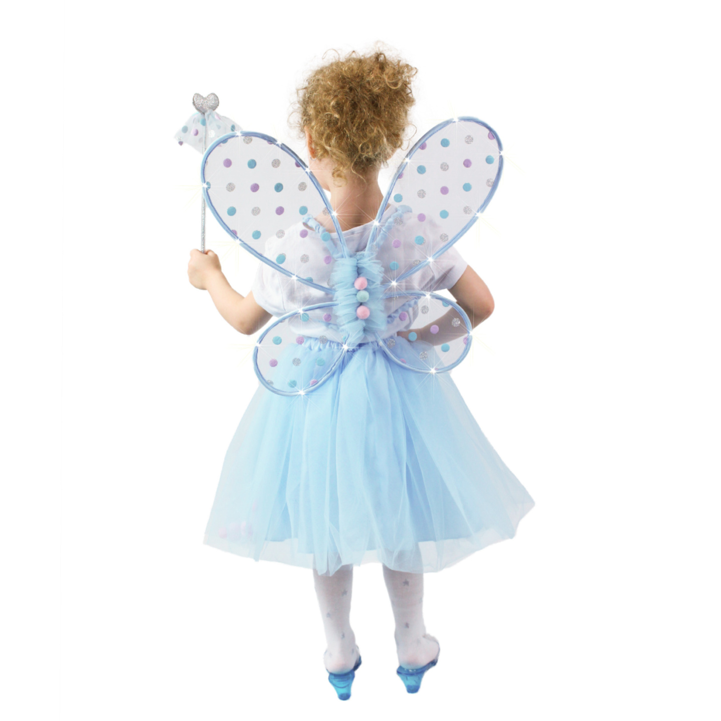 Krásná vílí sada pro malé holčičky! Sada obsahuje modrou tylovou TUTU sukýnku se saténovou spodničkou. Sukně je zdobena ve spodní části kuličkami, k tomu perfektně sladěná křídla a hůlka ve stejném motivu. V lemování křídel jsou zabudována světýlka, která po zapnutí svítí. Baterie jsou součástí....