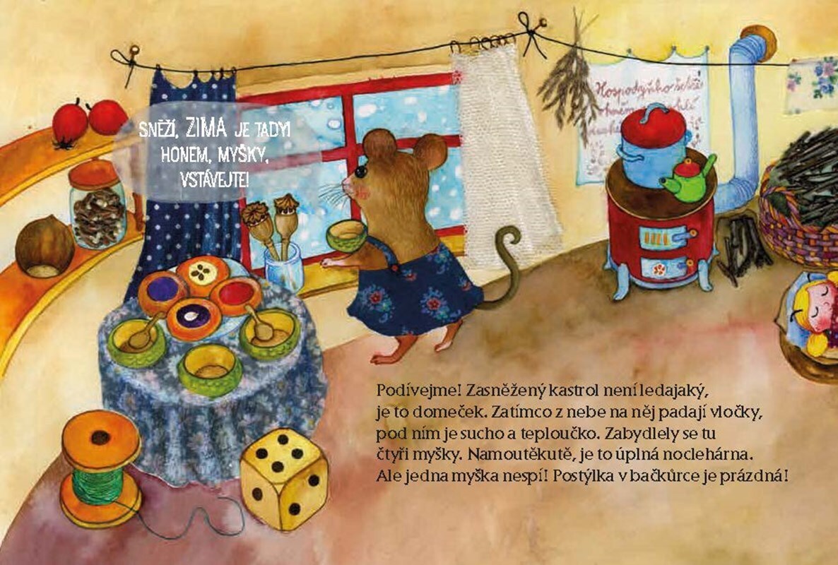 Co prožívají čtyři myšky během jednoho roku? V zimě většinou spí, jedna má postýlku z plechovky od sardinek, druhá z krabičky od sirek, třetí ze slaměných stébel, čtvrtá z bačkorky. Na jaře myšky vyskočí, pracují na zahrádce, v létě se koupají, mlsají ovoce, na podzim sklízejí záhonky a...