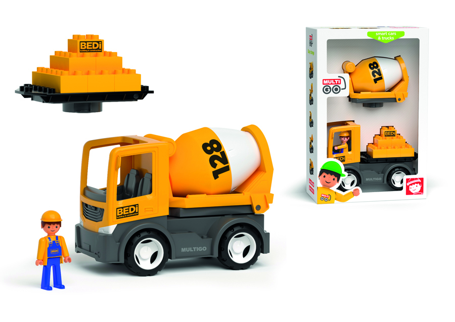 domíchávač, nástavbu stavební deska s 9 stavebními kostičkami kompatibilními s nejznámější stavebnicí a Igráčka stavbaře.