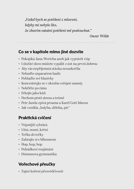 Jan Přeučil a Karel Voříšek spojili herecké a moderátorské umění a společně připravili knihu pro každého, kdo se chce zdokonalit v mluvení a přesvědčivosti před lidmi. Praktické řečnické triky a fígle ukazují nejen na sobě, ale i na kamarádech z branže. Nečekejte školometské povídání, autoři s...