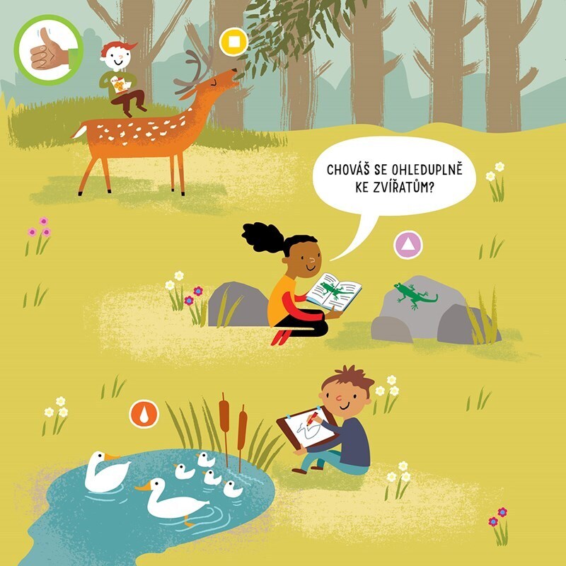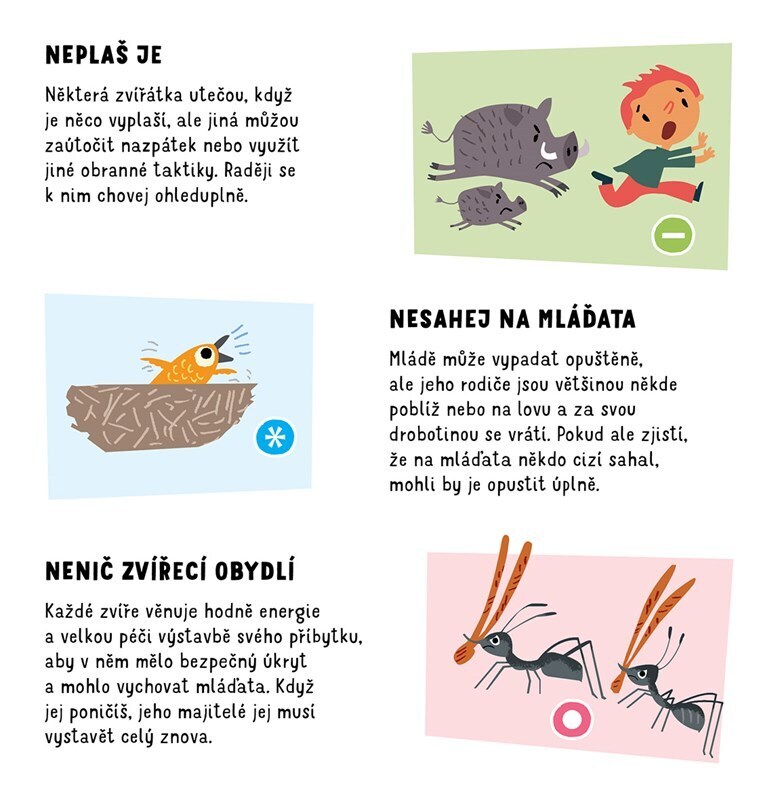 Tato knížka ti ukáže, jak si ohleduplně počínat v přírodě i v kontaktu se zvířaty. Dokonce se dozvíš, co dobrého můžeš udělat pro zdraví naší planety! Prohlédni si jednotlivé situace a zkus vymyslet, jak by se v nich dalo zachovat lépe. Pod odklápěcími stránkami pak najdeš správné...