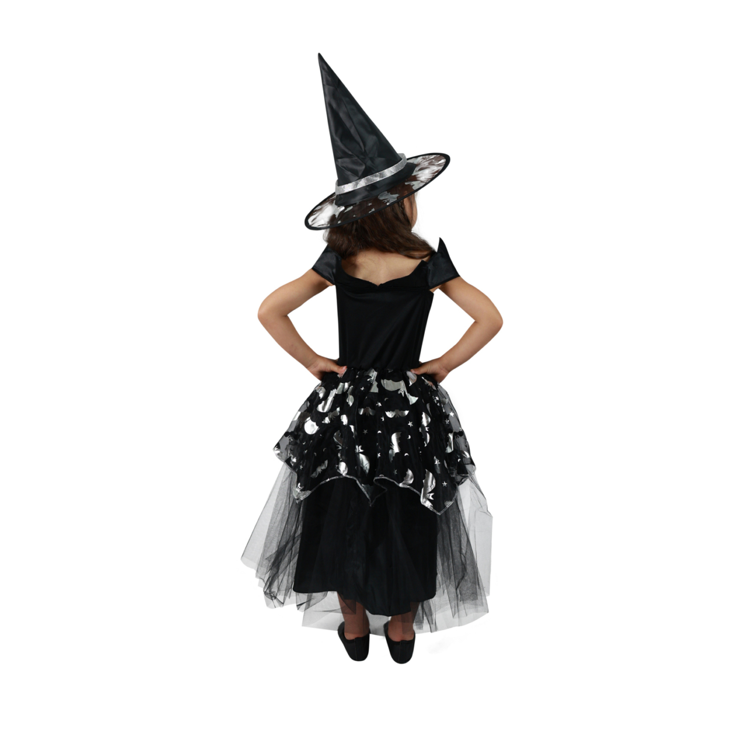 Parádní čarodějnický kostým s netopýřími motivy! Kostýmek o velikosti M je určen pro holčičky ve věkovém rozmezí 6-8 let (117-128 cm). Černé šaty s nadýchanou sukní jsou zdobeny stříbrnými prvky a stříbrným lemováním. Součástí balení je také perfektně sladěný klobouk, který je rovněž zdoben...