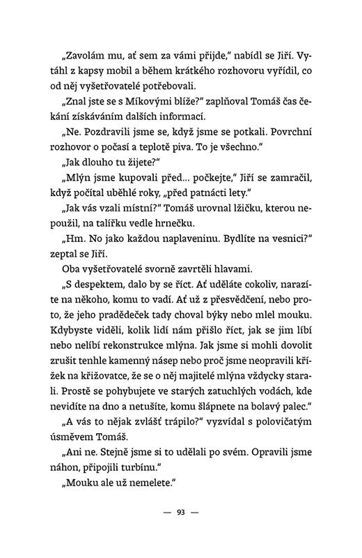 Emina kamarádka zmizí bez jediného slova. O dva dny později se v nedaleké vesničce objeví tělo. Probralo se v údolí protkaném říčkou Litavkou, jejími slepými rameny a starodávnými mlýny k životu něco děsivého? Nebo zaúřadovala obyčejná lidská zloba? Celý případ smrdí bahnem a pořádným průšvihem...