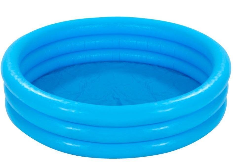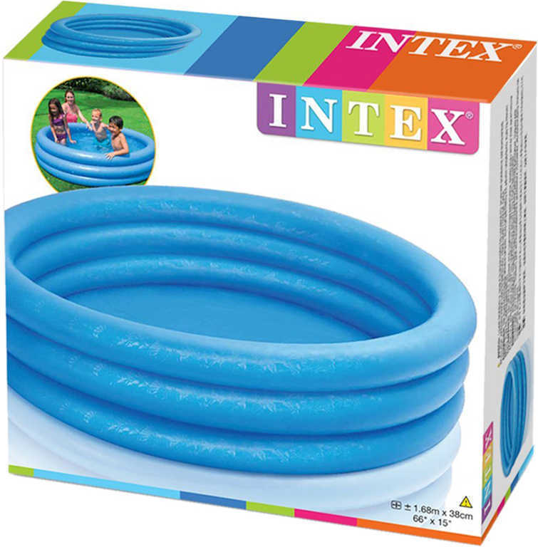 Větší dětský bazének modré barvy, šířka 168 cm a výška 38 cm. UPOZORNĚNÍ: Používat pouze ve vodě takové hloubky, kde dítě stačí, a pouze pod dohledem dospělé osoby.