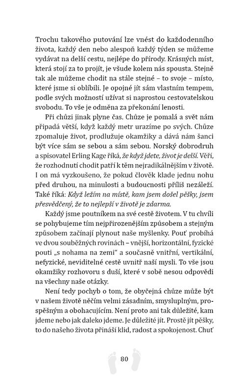 Chůze je tím nejpřirozenějším způsobem pohybu, který zlepšuje zdraví a fyzickou kondici. Chůze pomáhá ke zklidnění, k vyrovnání se s problémy každodenního života, zastavení, vnímání krásy. Kniha přináší široký záběr informací, které souvisí s chůzí, poutními cestami, lesní terapií...