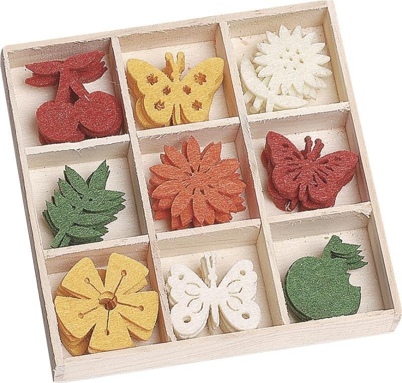 Filcové ozdoby v praktickém boxu, 9 motivů po 5 ks. Rozměr jednoho motivu cca 3cm x 3cm. Ideální pro zdobení přáníček, dárků, kr...