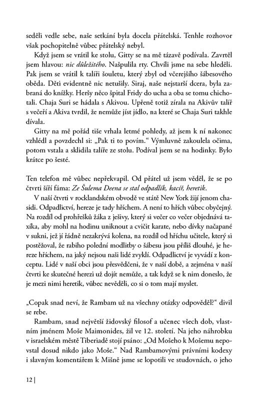 Shulem Deen vyrůstal v uzavřené chasidské komunitě ve Spojených státech. Vnější svět takřka neznal a v osmnácti letech se oženil, aby s manželkou vychovával pět dětí. Takový byl jeho život až do chvíle, kdy při jedné návštěvě veřejné knihovny objevil internet, a tato událost mu zcela převrátila...