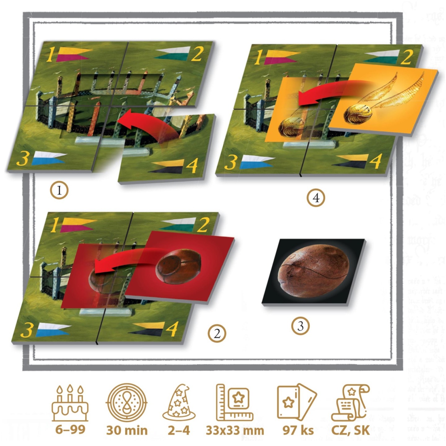 Sveďte napínavý souboj o co nejvyšší počet Camrálů, a následně o jedinou Zlatonku! A vyhýbejte se Potloukům, které vám mohou nadělit nelítostní soupeři. Napínavá rodinná hra pro malé i velké hráče, hra pro čaroděje i pro mudly.
