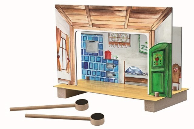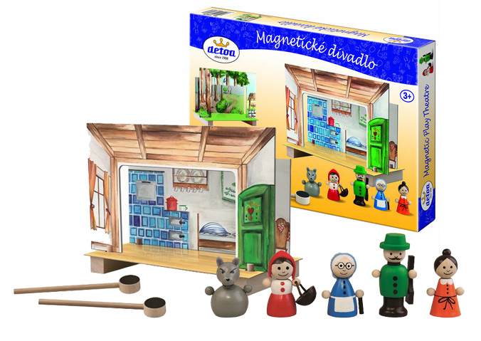 Magnetické divadlo Červená Karkulka obsahuje oboustranně malované kulisy les-chaloupka. Děti si mohou odehrát klasickou pohádku pomocí dřevěných tyček a figurek s magnetem. Výrobek je nevhodný pro děti do 3 let.