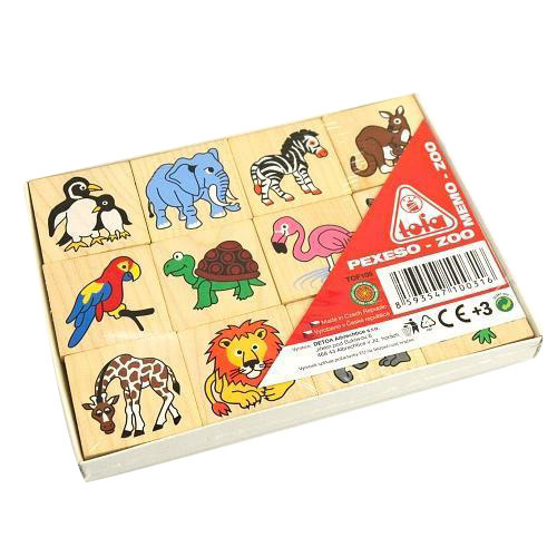 Dřevěné pexeso s obrázky zvířátek ze ZOO pro procvičení soustředění a paměti. Hra obsahuje 24 kusů o velikosti 40 x 40 x 5 mm. Baleno v krabičce z tvrdého papíru. Nevhodné pro děti do 3 let. Obsahuje malé části. Výrobek je zdravotně nezávadný.