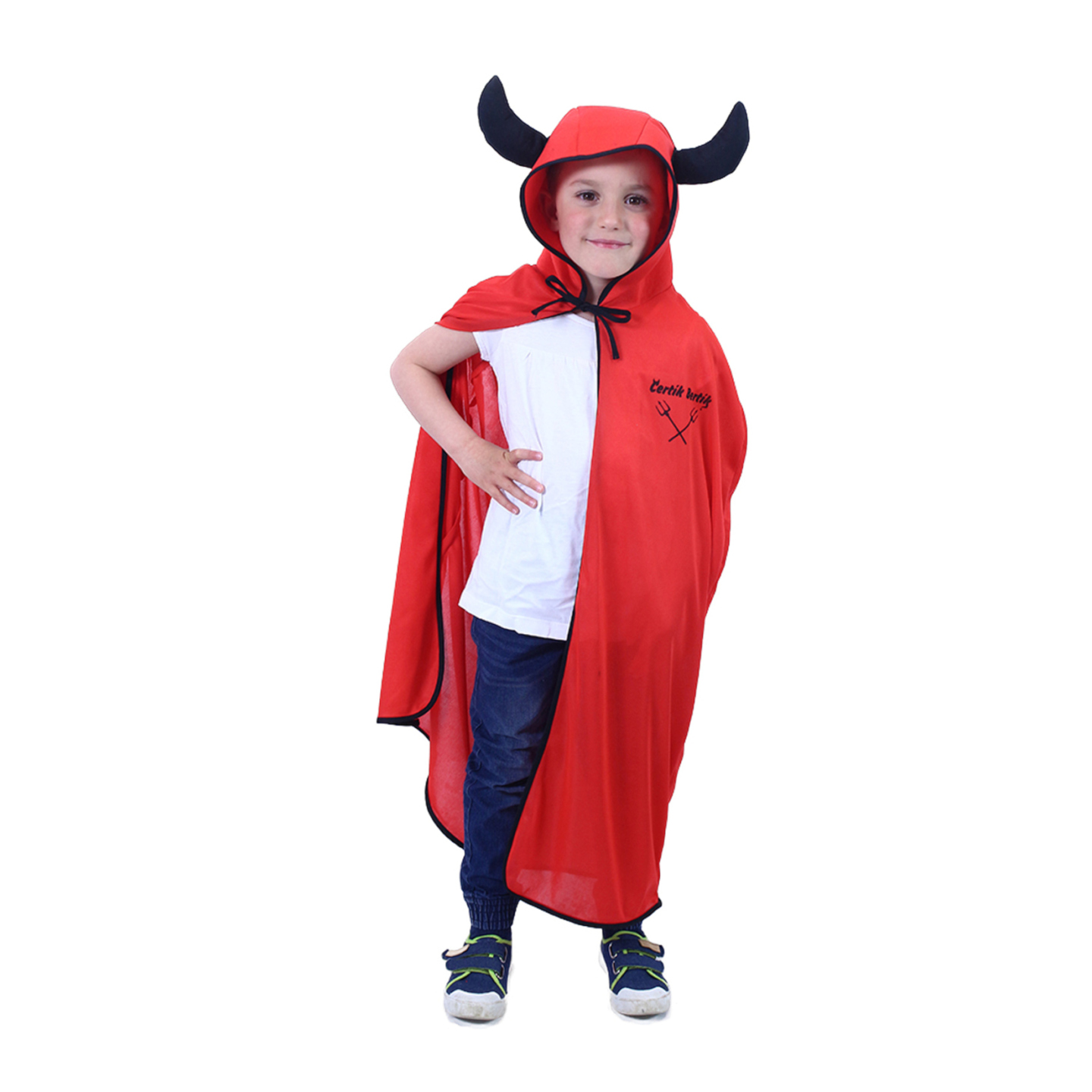 Karnevalový plášť čerta v červeno-černé barvě a v univerzální velikosti je určen pro děti ve věkovém rozmezí 3-10 let (104-146 cm). Balení obsahuje plášť s kapucí, na které jsou přišity rohy. Délka pláště je cca 104 cm.