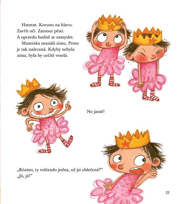 Rózinka je malá holčička s velikou fantazií. Představte si, jaké má v pokojíčku schované poklady! Tak například čarovný prstýnek, který ji může přenést, kam si bude přát, divotvorný prášek a několik princeznovských korun s kouzelnou mocí. Potřebuje je, když musí rozlousknout nějaký oříšek. A to...
