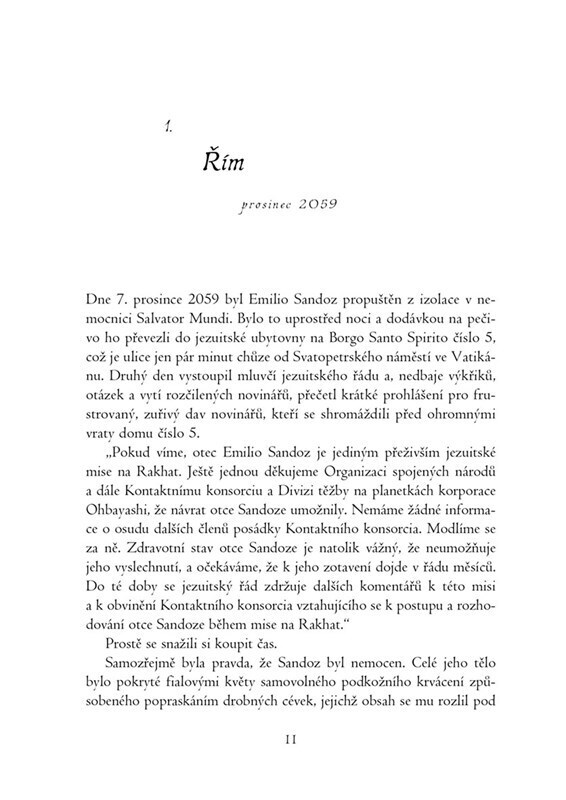 Lidstvo konečně získalo důkaz života ve vesmíru. Zatímco diplomaté OSN vedou debaty o tom, jak zorganizovat misi na planetu Rakhat, odkud byl zachycen signál, řád jezuitů tam tajně vysílá vlastní osmičlennou vědeckou výpravu. Z té se však v roce 2059 vrací pouze kněz Emilio – zohavený a...