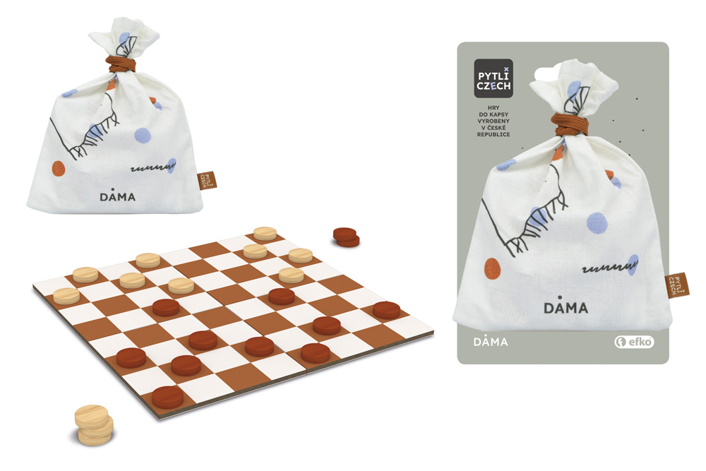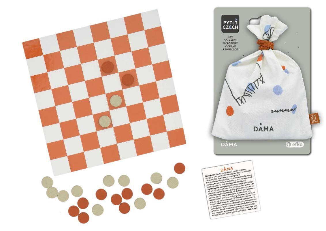 Dáma je jedna z nejoblíbenějších logických deskových her pro dva hráče. V našem originálním provedení vám zpříjemní chvíle táboře, na cestě vlakem nebo třeba u moře. Stačí z baťůžku vytáhnout praktický pytlík a promyslet, jakými tahy ohromíte