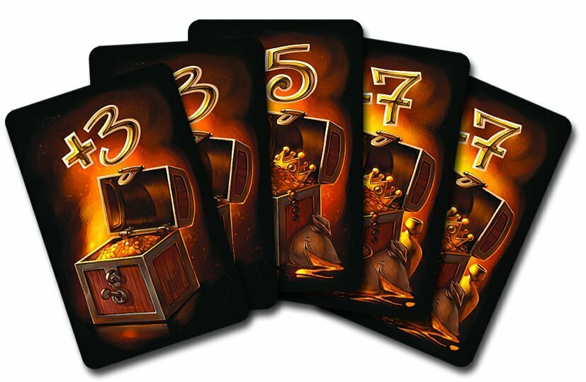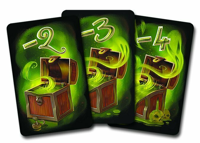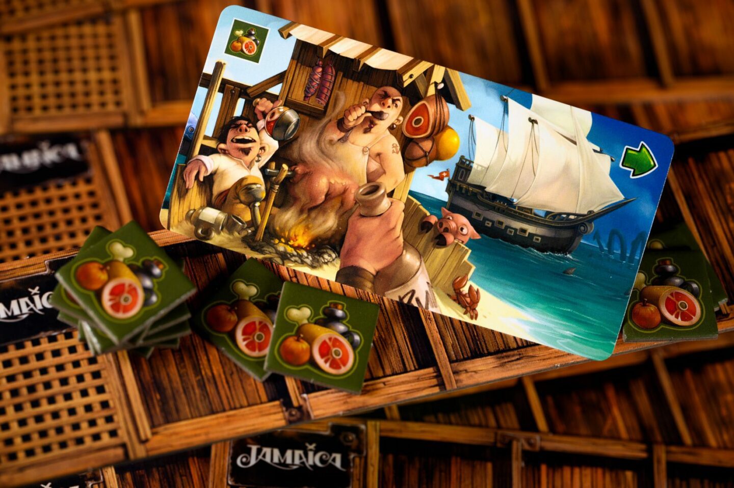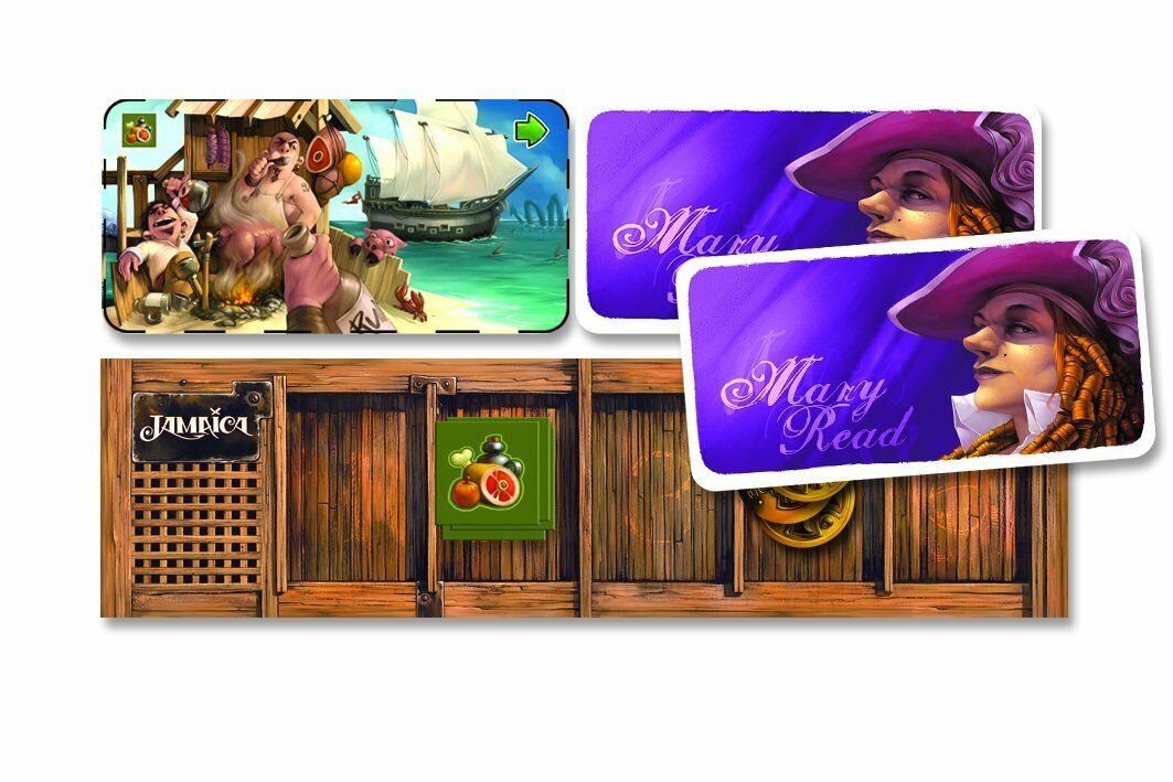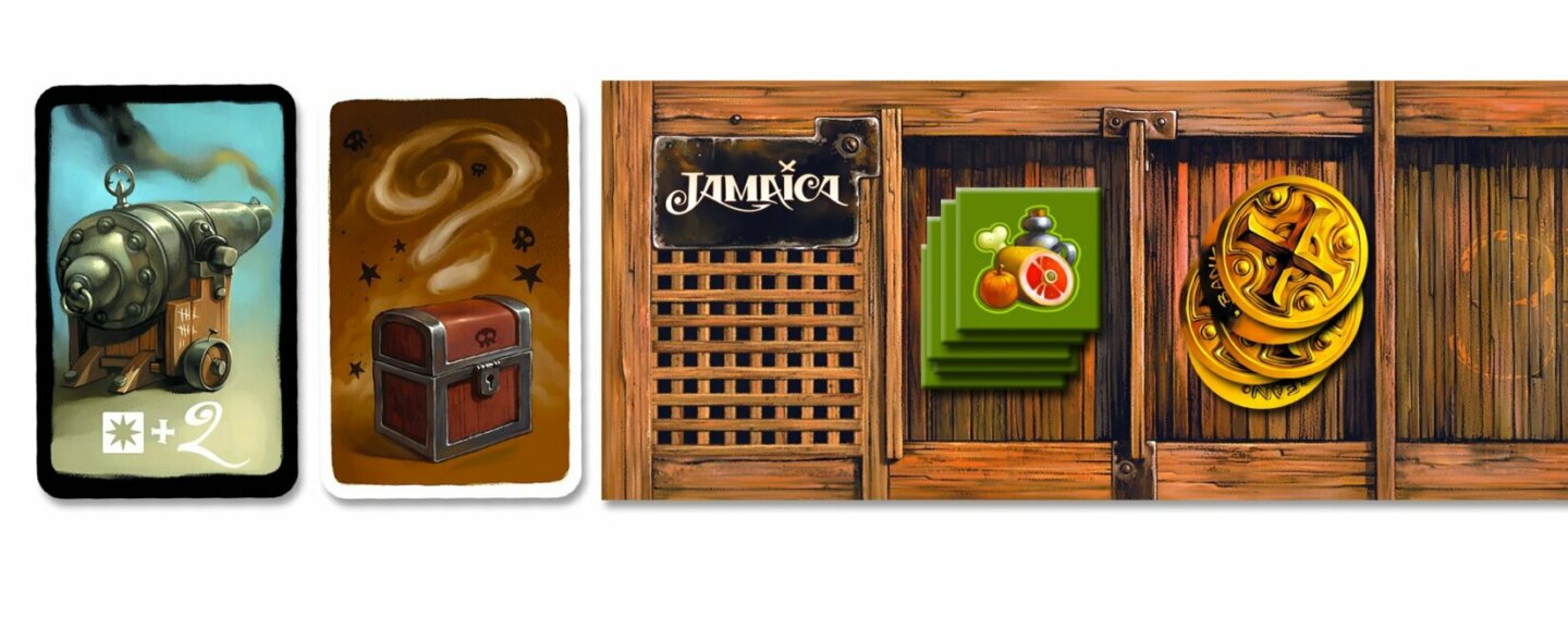 karet akce 12 karet pokladů 80 zlatých dublonů 45 žetonů jídla 45 žetonů střelného prachu 9 žetonů pokladů 1 žeton kompasu 2 kostky akcí 6 lodí 6 desek nákladních prostorů 1 kostka boje/nedostatku 1 brožura s pravidly