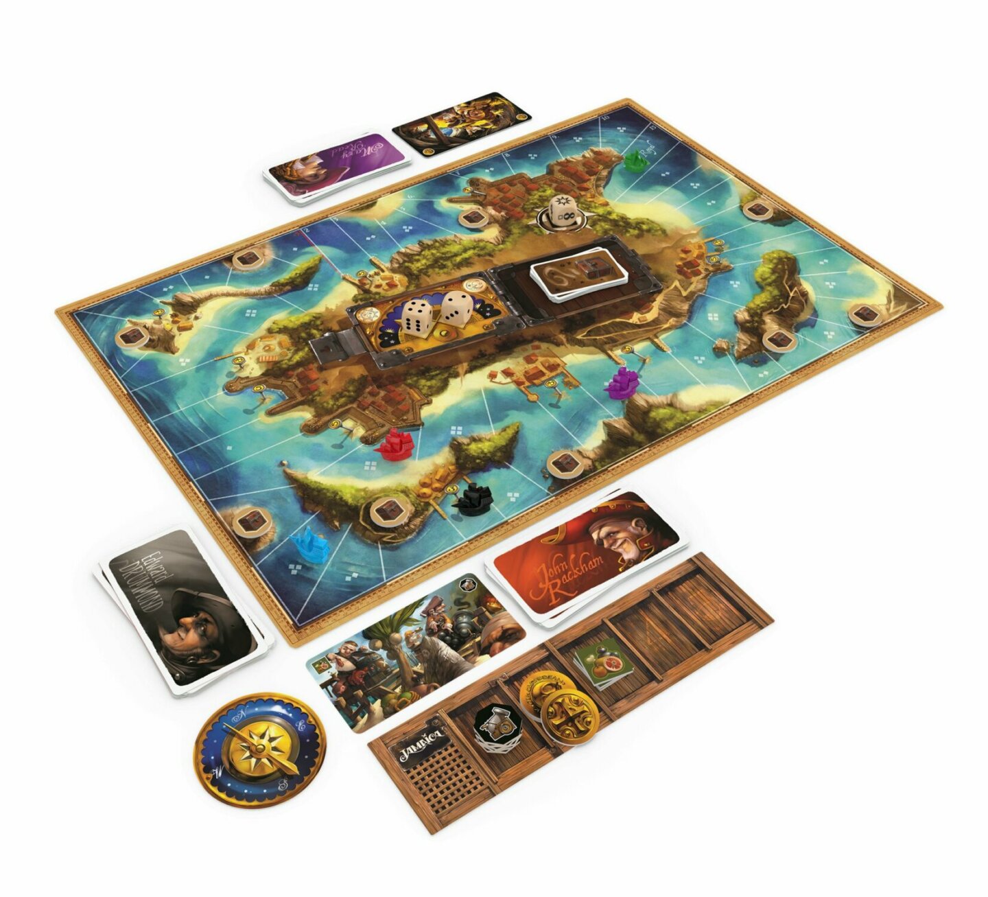ostatními. Cílem hry je objet ostrov jako první s pořádným lupem, pokud možno. Zvolte si ranní a večerní akce. Naplňte své podpalubí jídlem, střelným prachem a poklady, zaútočte na své soupeře a dokončete závod kolem ostrova jako nejbohatší! Obsah balení: 1 hrací plán 66