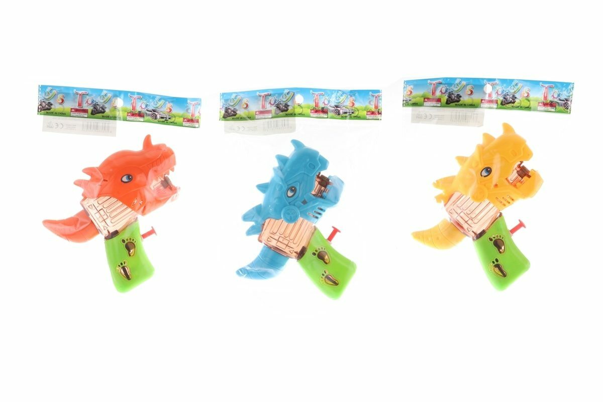 Plastová vodní pistole ve tvaru dinosaura. Velikost cca 15 x 12 x 4,5 cm. Baleno v igelitu. Věk 3+